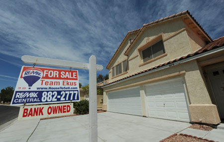這是8月22日在美國拉斯韋加斯拍攝的一處待出售的止贖房屋。 標準普爾公司發(fā)布的凱斯-席勒房價指數(shù)顯示,拉斯韋加斯房價2009年下跌12%且目前仍在下降,在美國20個大城市中表現(xiàn)最差。