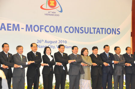 8月26日,在越南峴港,中國(guó)商務(wù)部長(zhǎng)陳德銘(左五)與東盟國(guó)家經(jīng)貿(mào)部長(zhǎng)合影。 當(dāng)日,中國(guó)-東盟經(jīng)貿(mào)部長(zhǎng)會(huì)議當(dāng)天在峴港舉行。