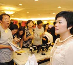 8月24日,康泰旅行社總經(jīng)理劉美詩(shī)(右)出席記者會(huì)。 當(dāng)日中午,香港康泰旅行社召開記者會(huì)介紹,受菲律賓人質(zhì)劫持事件影響的香港旅行團(tuán)成員大部分通過旅行社購(gòu)買了保險(xiǎn),保險(xiǎn)公司將按照特殊情況處理,對(duì)每名遇害者按照最高額度100萬(wàn)港元進(jìn)行理賠,傷者醫(yī)療費(fèi)用最高也可至100萬(wàn)港元。新華社發(fā)