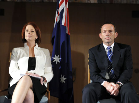 9月7日,在澳大利亞堪培拉舉行的榮譽(yù)士兵紀(jì)念日活動上,澳大利亞總理、工黨領(lǐng)袖吉拉德(左)和反對黨領(lǐng)袖艾伯特坐在國旗兩側(cè)。工黨當(dāng)日下午宣布獲得澳大利亞聯(lián)邦選舉最終勝利,吉拉德將組建新一屆政府。