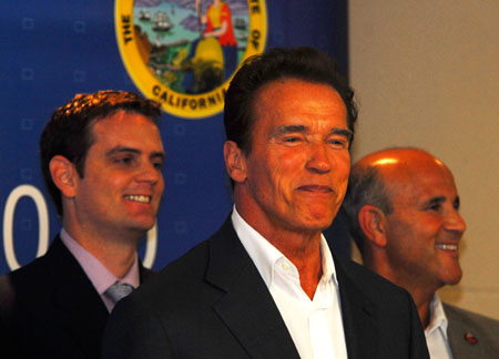 9月12日,美國加利福尼亞州州長、著名影星施瓦辛格(中)在上海世博園美國館舉行新聞發(fā)布會。 當日,施瓦辛格造訪上海世博園,并在美國館正式宣布,加州將申請在硅谷舉辦2020年世博會。