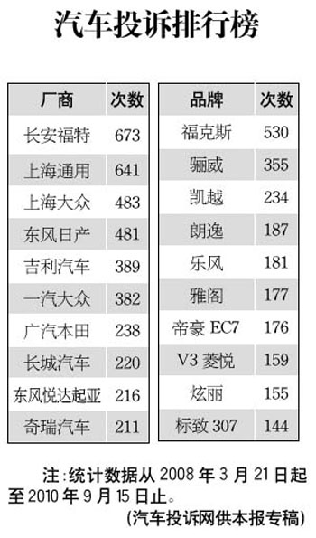 汽車投訴排行榜公布 長安福特高居榜首