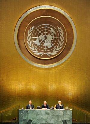 9月20日至9月22日,聯(lián)合國千年發(fā)展目標高級別會議將在紐約聯(lián)合國總部舉行。包括中國國務院總理溫家寶在內(nèi)的近140位國家元首或政府首腦齊聚紐約,審議千年發(fā)展目標進展情況,評估障礙和缺口,商討具體對策,以期在2015年實現(xiàn)全部八項目標。 圖為聯(lián)合國秘書長潘基文(左)、第65屆聯(lián)大主席約瑟夫·戴斯(中)、第64屆聯(lián)大主席圖里基出席會議。