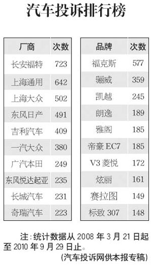 長安福特高居汽車投訴排行榜榜首