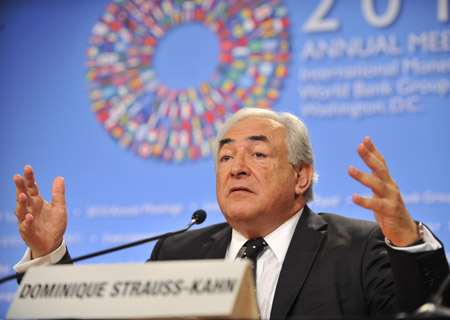 10月7日,在美國首都華盛頓,國際貨幣基金組織(IMF)總裁多米尼克·施特勞斯-卡恩舉行新聞發(fā)布會。 國際貨幣基金組織(IMF)和世界銀行秋季年會即將在華盛頓舉行。(相關(guān)報道見四版)