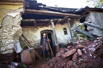 一位年老的村民正在災后清理被泄漏廢水沖刷后的房屋和花園。法新社發(fā) |