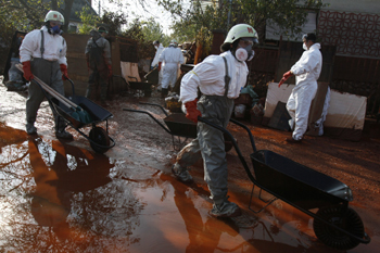 身穿防護服的營救人員正在受災的村莊中清理紅色的有毒廢水。路透社發(fā) |