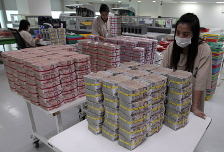 泰國政府12日同意對外國泰銖債券投資者獲得的利息和資本收益征收15%的代扣所得稅,以阻止泰銖近來的不斷升值。此次針對的泰銖債券包括政府公債以及國有企業(yè)和泰國央行發(fā)行的債券。近來,泰銖已經(jīng)升至13年來最高水平。圖為銀行工作人員在整理泰銖。