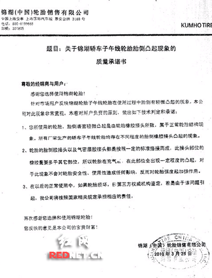 | 廠家錦湖輪胎公司在《質量承諾書》中稱,輪胎輕微凸起屬正,F(xiàn)象 |
