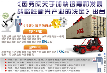 10月18日,《國務(wù)院關(guān)于加快培育和發(fā)展戰(zhàn)略性新興產(chǎn)業(yè)的決定》指出,根據(jù)戰(zhàn)略性新興產(chǎn)業(yè)的特征,立足我國國情和科技、產(chǎn)業(yè)基礎(chǔ),現(xiàn)階段將重點(diǎn)培育和發(fā)展節(jié)能環(huán)保、新一代信息技術(shù)、生物、高端裝備制造、新能源、新材料、新能源汽車等產(chǎn)業(yè)。到2015年,七大戰(zhàn)略性新興產(chǎn)業(yè)的增加值占中國GDP的比重將提高到8%,到2020年將升至15%。