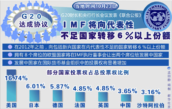 改革后,中國的配額占比將從3.65%增加到6.19%,成為第三大股東;印度也將躍升為第八大股東,俄羅斯為第九,巴西為第十。金磚四國合計,總計占14.18%的配額。新興國家合計,所占配額將增加到42.29%,甚至更高。該協(xié)議令外界頗感意外,因?yàn)橥饨缭绢A(yù)期該協(xié)議將在于下月在韓國舉行的G20首腦峰會上才正式公布。