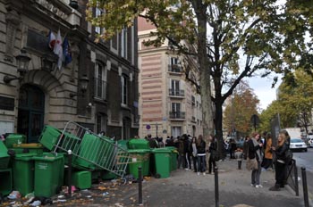 數(shù)百所中學參加罷工,很多中學生無課可上,無人清理的垃圾箱堵住了校門口。新華社記者