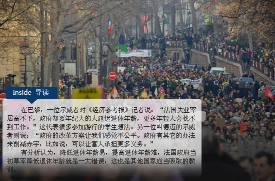 在巴黎,一位示威者對《經(jīng)濟參考報》記者說:“法國失業(yè)率居高不下,政府卻要年紀大的人延遲退休年齡,更多年輕人會找不到工作。”這代表很多參加游行的學生想法。另一位叫德邁的示威者則說:“政府的改革方案讓我們感覺不公平。政府有其它的辦法來削減赤字,比如說,可以讓富人承擔更多義務!