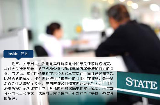 編者按:近日,關(guān)于居民生活用電實(shí)行階梯電價(jià)的意見征求階段結(jié)束,從社會(huì)反饋意見看,逾三成群眾擔(dān)心階梯電價(jià)方案會(huì)增加百姓的負(fù)擔(dān)。應(yīng)該說,實(shí)行階梯電價(jià)在不少國家早有實(shí)行,而且已經(jīng)建立起比較成熟的模式,那么國外推行階梯電價(jià)的科學(xué)性在哪里、是否給老百姓生活增加了負(fù)擔(dān)、中國應(yīng)該如何借鑒國外經(jīng)驗(yàn)?為此,《經(jīng)濟(jì)參考報(bào)》記者比較世界上其他國家的居民電價(jià)定價(jià)模式,采訪部分業(yè)內(nèi)人士和專家,試圖對(duì)目前階梯電價(jià)引發(fā)的爭(zhēng)議提供一些背景的解答。