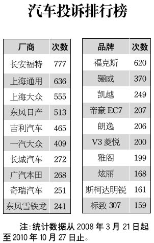 汽車投訴排行榜[2010-10-27]