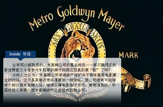 由于無法償付高達(dá)40億美元的巨額債務(wù),曾是全球最大電影公司的米高梅11月3日宣布申請(qǐng)破產(chǎn)保護(hù),其申請(qǐng)也隨即獲得法院的批準(zhǔn)。全球觀眾都熟悉的、米高梅公司的著名標(biāo)志——那只贏得無數(shù)影迷贊譽(yù)又令競(jìng)爭(zhēng)對(duì)手膽寒的獅子利奧這回真的要“歇”了嗎?