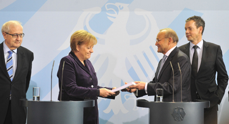 德國經(jīng)濟顧問委員會10日向政府提交了年度經(jīng)濟評估報告。報告稱,今年德國國內(nèi)生產(chǎn)總值將增長3.7%,2011年將增長2.2%,均好于政府預(yù)測。明年經(jīng)濟增速出現(xiàn)回落的主要原因是政府可能退出經(jīng)濟刺激計劃。該報告被認(rèn)為是德國最權(quán)威的經(jīng)濟預(yù)測報告之一。圖為德國總理默克爾接過報告。