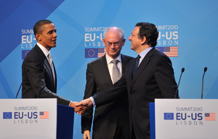 11月20日,在葡萄牙首都里斯本,歐洲理事會(huì)主席范龍佩(中)、歐盟委員會(huì)主席巴羅佐(右)和美國(guó)總統(tǒng)奧巴馬在歐盟—美國(guó)峰會(huì)后出席新聞發(fā)布會(huì)。當(dāng)天,歐盟—美國(guó)首腦會(huì)議在里斯本舉行,歐美領(lǐng)導(dǎo)人強(qiáng)調(diào)歐盟和美國(guó)應(yīng)深化跨大西洋的合作。