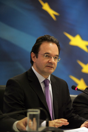 11月23日,希臘財(cái)長帕帕康斯坦季努出席在雅典舉行的新聞發(fā)布會。 帕帕康斯坦季努當(dāng)天表示,希臘仍然考慮在2011年重返國際市場,并履行其還債義務(wù),結(jié)構(gòu)性改革應(yīng)對債務(wù)危機(jī),而不再增加更多的緊縮政策。