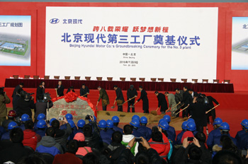 在順義區(qū)楊鎮(zhèn)工業(yè)開發(fā)區(qū),一座引領(lǐng)世界汽車工業(yè)新標(biāo)桿的現(xiàn)代化工廠——北京現(xiàn)代第三工廠破土奠基。第三工廠計劃于2012年下半年投產(chǎn),規(guī)劃的整車產(chǎn)能為40萬輛,相應(yīng)的發(fā)動機產(chǎn)能40萬臺。