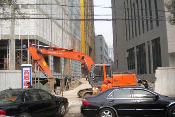 在合肥市重點工程——金鷹國際購物中心項目工地,一臺挖掘機停放在工地入口處。據(jù)一名工人介紹,11月2日晚,該工地突然出現(xiàn)了多名不明身份人員,隨后3輛大型挖掘機停放在工地,封堵了該工地出入口及施工現(xiàn)場,造成該工地正常施工中斷。截至12月2日,仍有一臺挖掘機停放在工地現(xiàn)場。