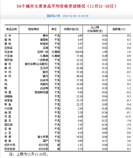 | 國家統(tǒng)計局6日發(fā)布的近期50個城市主要食品平均價格變動情況 |