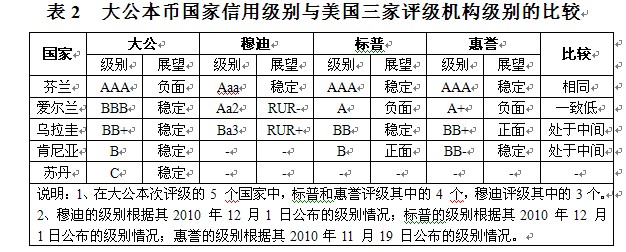 以5個(gè)國(guó)家的本幣信用級(jí)別為例,大公給出的級(jí)別與美國(guó)三家機(jī)構(gòu)存在明顯差異的國(guó)家是愛(ài)爾蘭,其他4個(gè)國(guó)家與三家機(jī)構(gòu)級(jí)別相同或處于三者之間。具體級(jí)別比較見(jiàn)表2