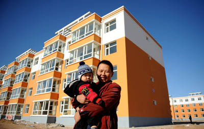 ▲準(zhǔn)格爾旗薛家灣鎮(zhèn)大塔村新建的小區(qū),正在裝修自家新房的白明忠高興地站在新房前。