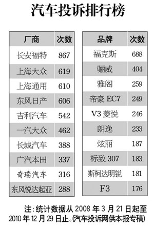 汽車投訴排行榜[2010-12-30]