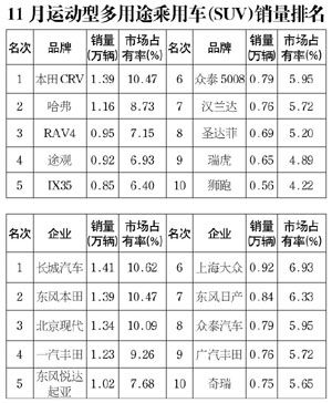 11月運(yùn)動(dòng)型多用途乘用車(SUV)銷售13.28萬輛,環(huán)比增長10.53%,同比增長85.87%。