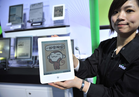 1月8日,在美國(guó)內(nèi)華達(dá)州拉斯韋加斯舉行的2011年國(guó)際消費(fèi)電子展上,一名Vivitek公司的工作人員展示彩色電子閱讀器。