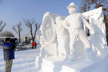 一位記者在拍攝第16屆哈爾濱國際雪雕比賽獲一等獎的作品。記者 李勇