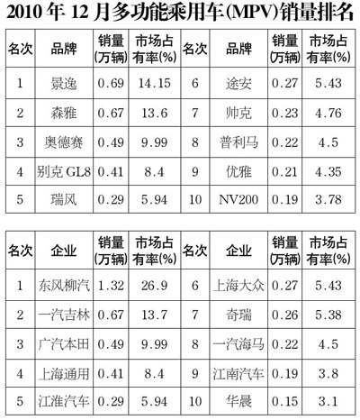 2010年12月多功能乘用車(MPV)銷售4.91萬(wàn)輛,環(huán)比增長(zhǎng)16.56%,同比增長(zhǎng)56.88%;12月,自主品牌MPV表現(xiàn)依舊突出,其中景逸月銷量首次位居第一。12月銷量排名前十位的MPV品牌共銷售3.68萬(wàn)輛,占MPV總銷量的75%。