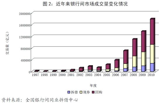 一是成交量繼續(xù)大幅增加。2010年,銀行間市場成交量近180萬億元,同比增長31.1%。其中,現(xiàn)券成交64萬億元,同比增長35.5%;拆借成交27.9萬億元,同比增長44%;質(zhì)押式回購與買斷式回購成交87.6萬億元,同比增長24.6%。