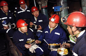 農(nóng)歷大年初一,山西焦煤汾西礦業(yè)集團(tuán)領(lǐng)導(dǎo)走進(jìn)新柳煤礦生產(chǎn)一線,為堅(jiān)守生產(chǎn)崗位的礦工送來年飯,共進(jìn)午餐。記者 武敵/攝 |