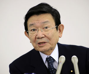 日本經濟財政大臣與謝野馨(中)14日在記者招待會上談及日本2010年名義GDP低于中國時表示,不要爭經濟的排列順序,中國的經濟崛起對鄰國日本來說令人高興。法新社 |