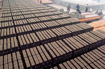山西省陽泉市南煤集團(tuán)投資2.4億元建成年產(chǎn)2.6億塊煤矸石免燒磚廠,以煤炭工業(yè)廢料煤矸石為主要原料,無需燃料,利用煤矸石自燃燒制成磚,每年可消耗煤矸石30余萬噸。不僅減少了污染,還有效利用了資源。資料照片 |