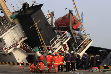 當(dāng)日凌晨3時左右,來自朝鮮的塞拉利昂籍貨輪“日光聯(lián)”號裝載著125箱集裝箱?吭诖筮B大窯灣港DCT一期碼頭9號泊位。在集裝箱作業(yè)過程中,船體發(fā)生嚴(yán)重傾斜。事發(fā)后,救援隊(duì)立即趕赴現(xiàn)場實(shí)施救援。目前,船上17名朝鮮籍船員全部安全轉(zhuǎn)移,船體已恢復(fù)正常,貨輪泄漏的燃油正在清理,事故原因尚在調(diào)查。