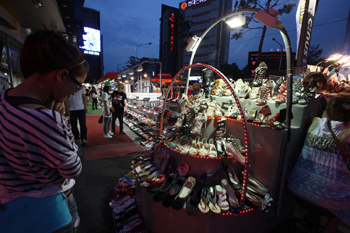 首爾明洞商區(qū)路邊的夜間鞋攤 記者 何璐璐 攝 |
