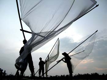 拉大網(wǎng)的時候,一般由被叫做“網(wǎng)頭”的人根據(jù)天氣、潮汐、風向和流水確定,大網(wǎng)也有大、中、小3種,其中大網(wǎng)長三四千米,中網(wǎng)長一二千米,小網(wǎng)則在千米以下,網(wǎng)寬均在4-6米之間。拉大風時,由參加拉網(wǎng)的人把網(wǎng)拉到竹排或者小艇上,先固定一頭,再由“網(wǎng)頭”一邊駕艇劃向海里,一邊呈半弧形撒下網(wǎng)繩和大網(wǎng),接著由岸上兩組人分別把住大網(wǎng)的兩頭,然后往岸上慢慢地一步一退地把大網(wǎng)收攏上來。網(wǎng)拉靠岸之時,就可把被圍困在大網(wǎng)內(nèi)的魚、蝦、蟹、鱟等一一捕捉,通常一網(wǎng)能收獲200公斤左右的魚。在20世紀60年代,村民們曾經(jīng)一網(wǎng)就能打上2000多公斤的魚,其中曾經(jīng)創(chuàng)下一網(wǎng)拉上5000多公斤的紀錄。