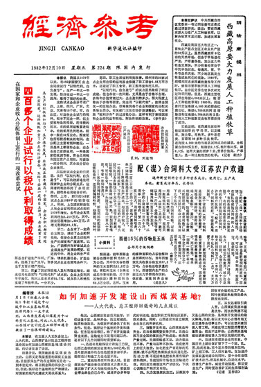 下邊的這張報樣是1982年12月10日《經(jīng)濟(jì)參考》(《經(jīng)濟(jì)參考報》前身)的一版,細(xì)心的讀者可能會發(fā)現(xiàn)在靠近頭版頭條的位置有兩枚篆刻印章,內(nèi)容是“慶祝五屆人大五次會議勝利閉幕”以及“熱烈歡呼新憲法莊嚴(yán)誕生”。1981年7月1日創(chuàng)刊的《經(jīng)濟(jì)參考報》正是以這種獨特的形式第一次報道了兩會。