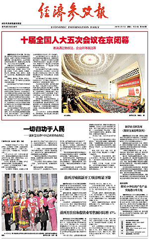 2007年3月17日《經(jīng)濟參考報》頭版頭條刊登了十屆全國人大五次會議閉幕的消息,突出報道了大會通過《物權(quán)法》和《企業(yè)所得稅法》。而事實上,本報在16日就已對兩部法律的修改情況做了大篇幅的報道。