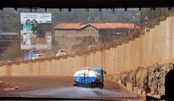 中國(guó)水利水電建設(shè)集團(tuán)公司的工程人員在肯尼亞內(nèi)羅畢錫卡高速路上施工。新華社記者 趙穎全/攝 |