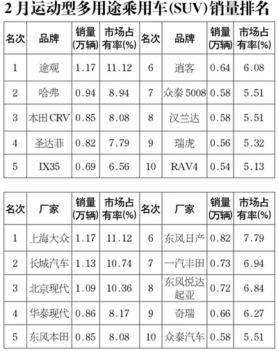 2月運動型多用途乘用車(SUV)銷售10.52萬輛,環(huán)比下降29.14%,同比增長49.54%。與上月相比,2月銷量排名前10位的SUV品牌中,哈弗、眾泰5008、漢蘭達排名保持不變;排名上升的有:途觀上升兩位,逍客上升三位,圣達菲上升六位;排名下降的有:IX35下降一位,本田CRV下降兩位,瑞虎、RAV4下降四位。
