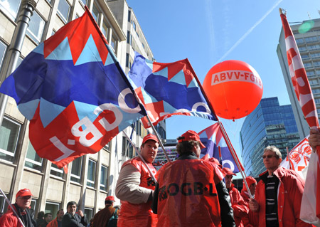3月24日,在比利時首都布魯塞爾,示威者高舉旗幟參加反對歐盟緊縮政策的游行。 當(dāng)天,歐盟舉行春季首腦會議,將通過整治歐洲主權(quán)債務(wù)危機(jī)的全面應(yīng)對方案。由于方案中一些緊縮政策涉及普通民眾的利益,因此招致工會的反對。大約2萬多名歐盟各國的工人24日走上布魯塞爾街頭舉行示威游行。