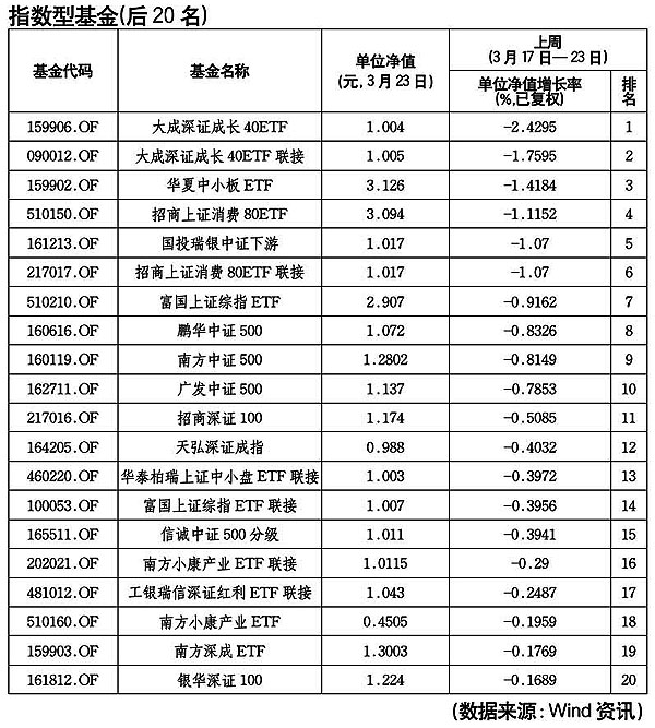 Wind資訊數(shù)據(jù)顯示,在本周(3月17日-23日)收益最差指數(shù)型基金排名中,“大成深證成長40ETF”和“大成深證成長40ETF聯(lián)接”位列前兩位;“招商上證消費80ETF”、“招商上證消費80ETF聯(lián)接”、“華夏中小板ETF”和“國投瑞銀中證下游”等四只基金仍然身居榜單前十名。