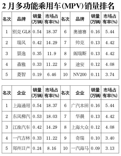與上月相比,2月MPV品牌前10位中,森雅排名保持不變,上月第三的別克GL8上升為第一,而上月第一、第二位的瑞風(fēng)、景逸分別退為第二、第三位;2月排名上升的有:菱智、奧德賽上升一位,帥克上升三位;排名下降的有:途安下降四位,普利馬、優(yōu)雅跌出前10。