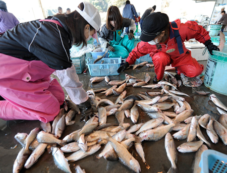 4月6日,人們在日本茨城縣北茨城的一個魚市上分揀剛剛打撈的活魚。