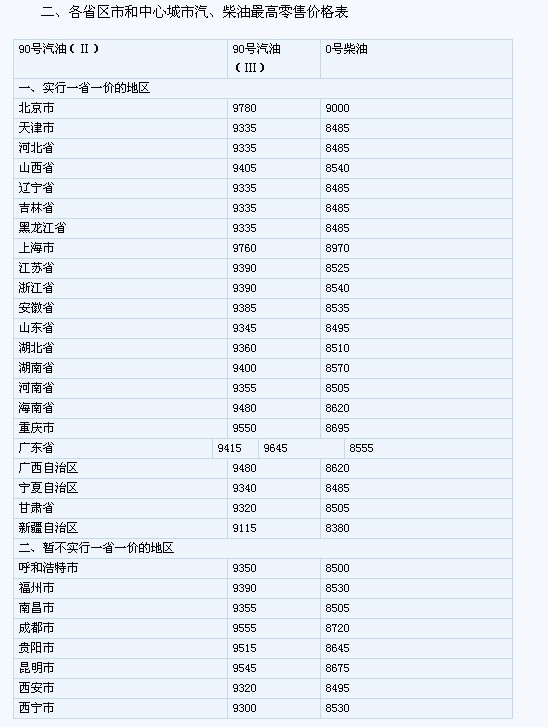 (一)成品油生產(chǎn)經(jīng)營企業(yè)供軍隊(duì)及新疆生產(chǎn)建設(shè)兵團(tuán)、國家儲(chǔ)備用汽、柴油(標(biāo)準(zhǔn)品,下同)供應(yīng)價(jià)格每噸分別提高500元和400元,調(diào)整后的汽、柴油供應(yīng)價(jià)格分別為每噸8580元和7730元。其他成品油價(jià)格相應(yīng)調(diào)整。調(diào)整后的成品油標(biāo)準(zhǔn)品價(jià)格見附表一。非標(biāo)準(zhǔn)品價(jià)格由成品油生產(chǎn)經(jīng)營企業(yè)按照國家規(guī)定的品質(zhì)比率確定。 (二)供交通、民航等專項(xiàng)用戶汽、柴油最高供應(yīng)價(jià)格等額提高。調(diào)整后的汽、柴油標(biāo)準(zhǔn)品最高供應(yīng)價(jià)格每噸分別為8980元和8130元。非標(biāo)準(zhǔn)品最高供應(yīng)價(jià)格由成品油生產(chǎn)經(jīng)營企業(yè)按照國家規(guī)定的品質(zhì)比率確定。其中,供鐵道、漁業(yè)、林業(yè)、農(nóng)墾用汽、柴油價(jià)格暫按供軍隊(duì)用油價(jià)格執(zhí)行。 對(duì)符合資質(zhì)的民營批發(fā)企業(yè)最高供應(yīng)價(jià)格,按最高零售價(jià)格扣減400元確定。當(dāng)市場(chǎng)零售價(jià)格降低時(shí),對(duì)民營批發(fā)企業(yè)的供應(yīng)價(jià)格也要相應(yīng)降低,保持價(jià)差不小于400元。 具體供應(yīng)價(jià)格可在不超過最高供應(yīng)價(jià)格的前提下,由供需雙方協(xié)商確定。 (三)各地汽、柴油最高零售價(jià)格等額提高。調(diào)整后各省(區(qū)、市)和中心城市汽、柴油最高零售價(jià)格水平見附表二。各省(區(qū)、市)價(jià)格主管部門按規(guī)定的品質(zhì)比率調(diào)整汽、柴油非標(biāo)準(zhǔn)品最高零售價(jià)格。 成品油零售企業(yè)可在不超過最高零售價(jià)格的前提下,自主制定具體零售價(jià)格。 (四)汽、柴油最高批發(fā)價(jià)格等額提高。合同約定由供方配送到零售企業(yè)的,最高批發(fā)價(jià)格按最高零售價(jià)格倒扣300元確定;合同未約定配送的,最高批發(fā)價(jià)格由各省(區(qū)、市)價(jià)格主管部門在300元的基礎(chǔ)上,再考慮運(yùn)雜費(fèi)因素確定。當(dāng)市場(chǎng)零售價(jià)格降低時(shí),批發(fā)價(jià)格也要相應(yīng)降低,保持批零價(jià)差不小于300元。各省(區(qū)、市)價(jià)格主管部門按規(guī)定的品質(zhì)比率制定非標(biāo)準(zhǔn)品最高批發(fā)價(jià)格。 成品油批發(fā)企業(yè)可在不超過最高批發(fā)價(jià)格的前提下,與零售企業(yè)協(xié)商確定具體批發(fā)價(jià)格。 (五)液化氣最高出廠價(jià)格按照與供軍隊(duì)等部門用90號(hào)汽油供應(yīng)價(jià)格保持0.92:1的比價(jià)關(guān)系確定,供需雙方可在不超過最高出廠價(jià)格的前提下協(xié)商確定具體價(jià)格。 (六)調(diào)整后的價(jià)格自2011年4月7日零時(shí)起執(zhí)行。
