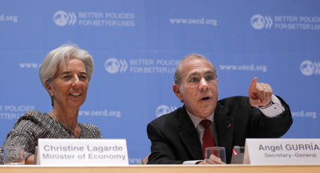 圖為11日安赫爾·古里亞和法國經(jīng)濟、財政和工業(yè)部長克里斯蒂娜·拉加德在經(jīng)合組織發(fā)布的法國經(jīng)濟形勢報告的新聞發(fā)布會上。